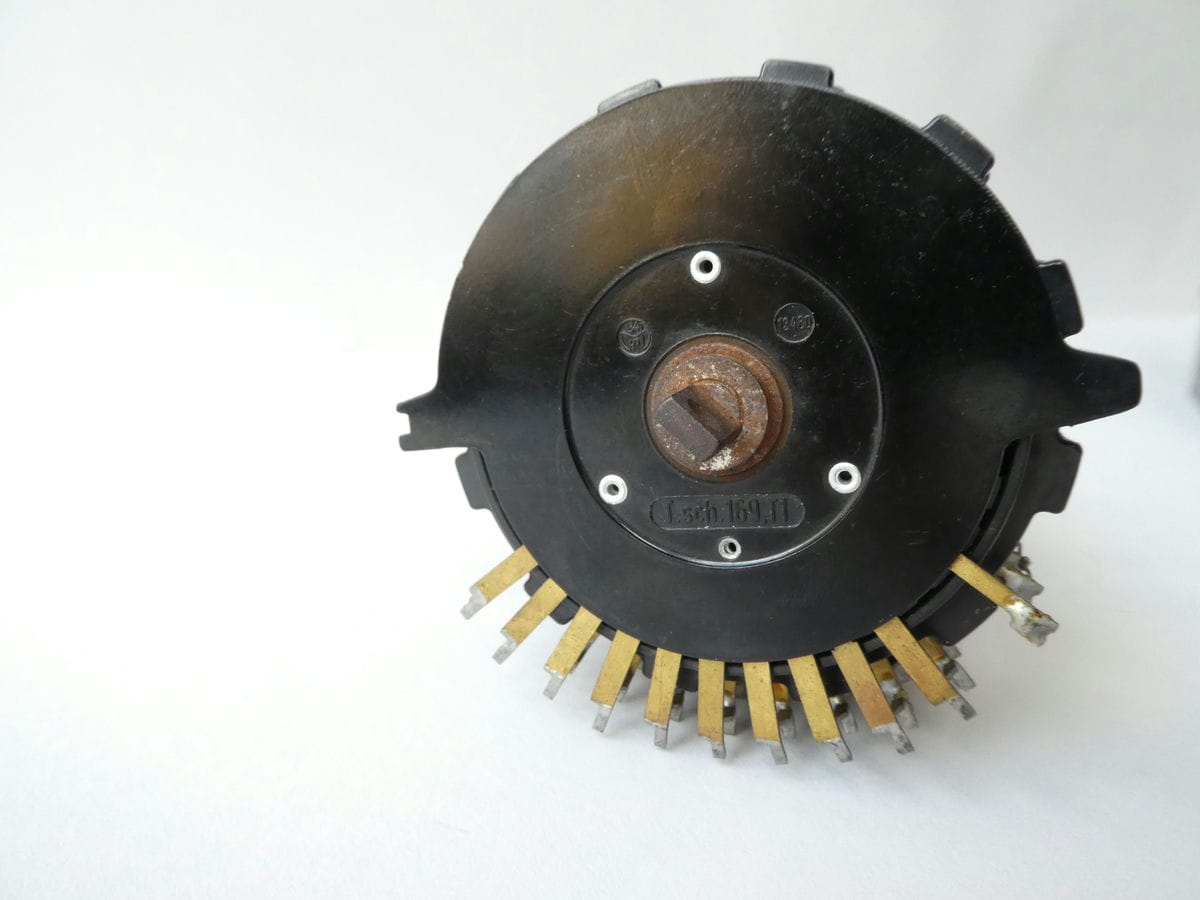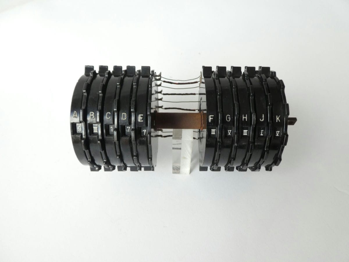 The rotors are made of dark Bakelite, the letters and Roman numerals are clearly legible in white paint.